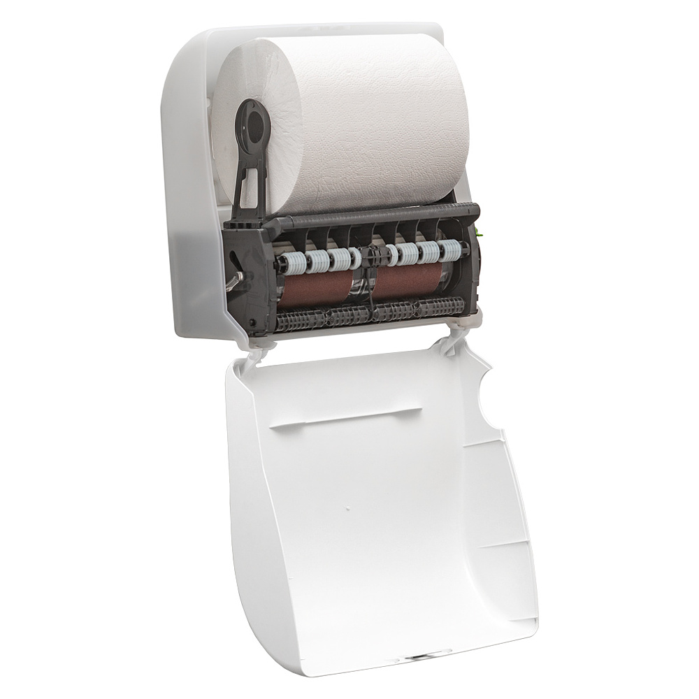 Компактный механический диспенсер для ролевых полотенец с любым количеством слоев – 1, 2, 3. Надежный и простой механизм подачи бумажного полотна, керамические ножи гарантируют до 250 000 отрезов (3 года работы) без сервисного обслуживания диспенсера.