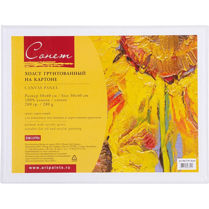 Холст на картоне «Сонет» идеален для работы на пленэре, на занятиях в художественной школе или студии. Удобен в использовании для начинающих художников и любителей живописи. Полностью готов к работе: выбирай предпочтительный размер будущей картины – и пиши. Холст на картоне всегда грунтуется, как правило, универсальным акриловым грунтом, по которому можно писать с масляными, темперными и акриловыми красками.